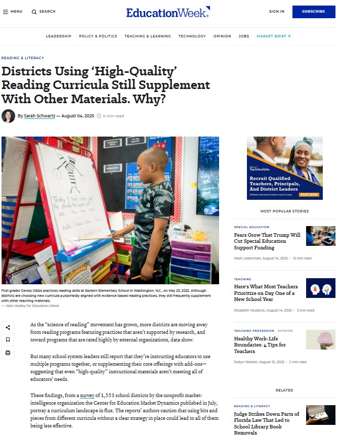 On August 4, 2025, EdWeek published an article citing CEMD's Executive Director, Lora Kaiser, and discussed CEMD's ELA briefs about district curriculum choices, coherence, and quality when it comes to supplementing reading materials.