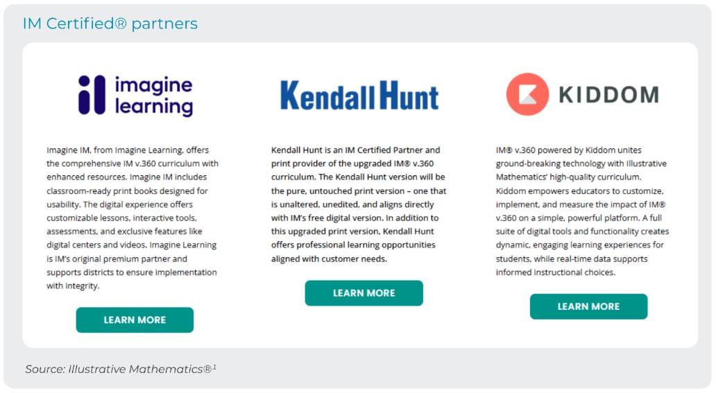 These three IM Certified partners have built their own products, using IM Math v.360, and are held to IM’s standards with any program additions. According to Illustrative Mathematics, “The IM Certified® designation ensures that schools and districts are accessing curricular materials that are always up-to-date, high-quality, and aligned to IM’s vision and guarantee any curriculum enhancements are thoroughly vetted by the IM authors.”³
