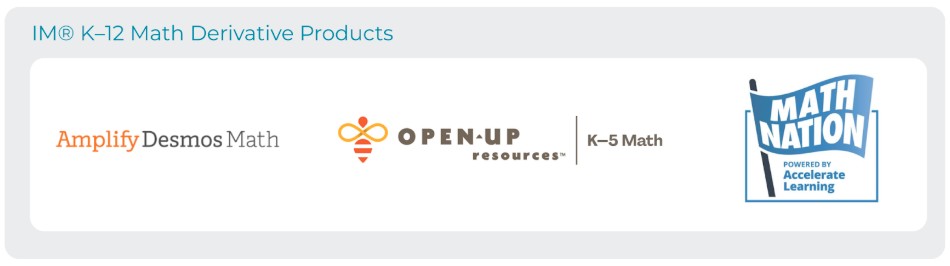 Because IM K–12 Math is an open educational resource (OER) and available for free under a Creative Commons (CC BY) license, this means that other curriculum providers can also use Illustrative Mathematics’ content as the foundation for their product. These products often share that their materials are “based on,” “authored by,” or “inspired by” Illustrative Mathematics. District leaders and adoption committees might hear these phrases within product presentations or see the credit given in marketing materials. Products that cite a foundation built on Illustrative Mathematics’ curriculum include: